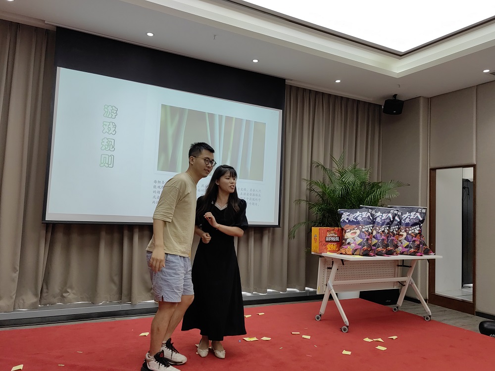 第二個環節是趣味游戲環節,游戲方式主要取自當下熱門娛樂節目《王牌對王牌》的經典游戲,結合公司實際,進行適當演變而成,內容包括“一起搖擺、‘心’火相傳、穿越‘火線’、慧眼識‘珠’、妙筆生花、火眼‘金’睛”等,均為競技類項目。參與人員隨機組成兩個小組進行PK,由工作人員在每輪游戲中對完成時間和完成結果兩個維度進行綜合測評,最終評選出優勝組獲得工會精心準備的零食大禮包。